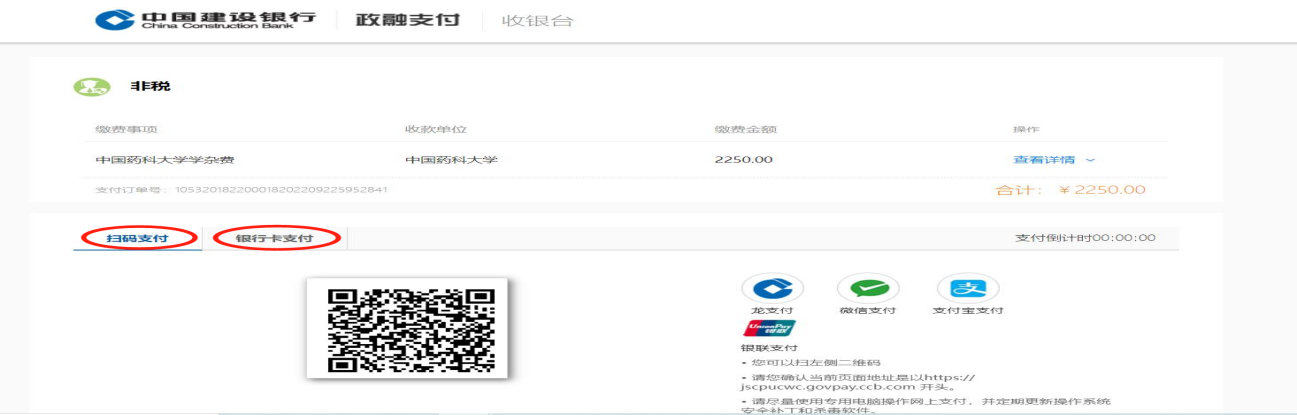 三、确认个人信息后,进入缴费页面,可选择微信、支付宝扫码支付,也可以用银行卡账号支付。