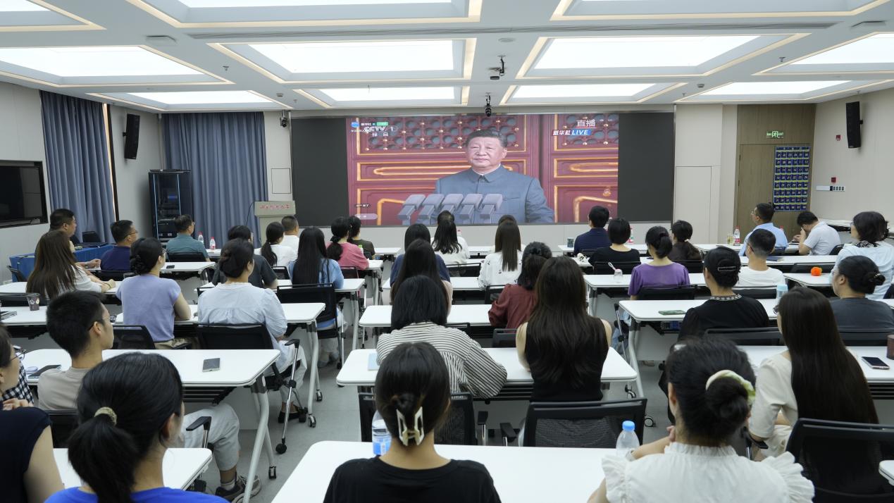 活动开始前,党员们早早来到报告厅,整齐就座,精神饱满,胸前的党徽熠熠生辉,现场气氛庄重而热烈。9时整,纪念活动正式开始。随着激昂的国歌声响起,全体党员起立,面向屏幕共唱国歌,向国旗行注目礼。习近平总书记的重要讲话发出了“铭记历史、缅怀先烈、珍爱和平、开创未来”的伟大号召,让在场的党员们心潮澎湃、激动万分。随后的阅兵式环节,党员们全神贯注,认真投入;当受阅部队迈着整齐有力的步伐通过天安门广场时,磅礴的气势、坚定的力量和飒爽的英姿让党员们无比震撼;而多种新型武器装备和信息技术方队的亮相更是让人感受到了无比的自豪和荣光。