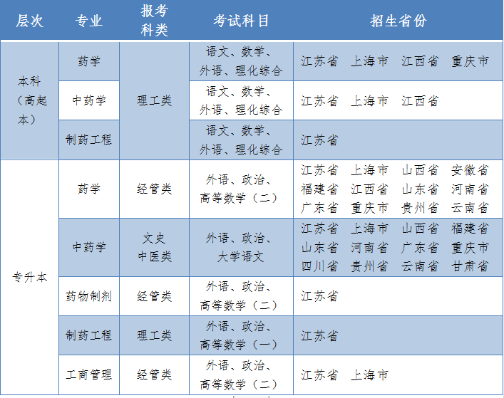 药学、中药学、制药工程、药物制剂专业专升本学制3年;工商管理专升本学制2.5年;药学、中药学、制药工程本科学制5年。